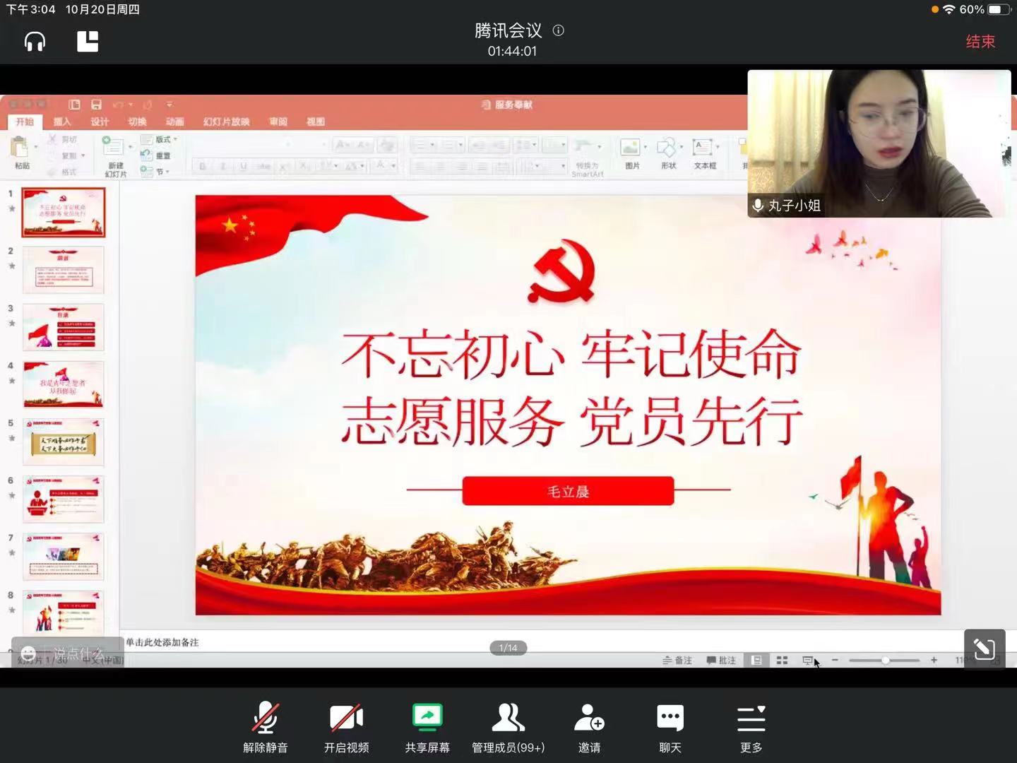学生第一党支部教师党员赵梦瑶以二十大开幕会为切入点,通过讲述老一辈无产阶级革命家的生动事迹,号召同学们学习他们身上的伟大精神,提高政治站位,树立大局意识,强化责任担当。强调广大青年学生要主动接过时代的接力棒,树立理想坚定信念,砥砺奋斗锤炼党性,弘扬作风践行使命。从小事做起,从当下做起,立足本职,积硅步致千里,努力成为可堪大用能担重任的栋梁之才。