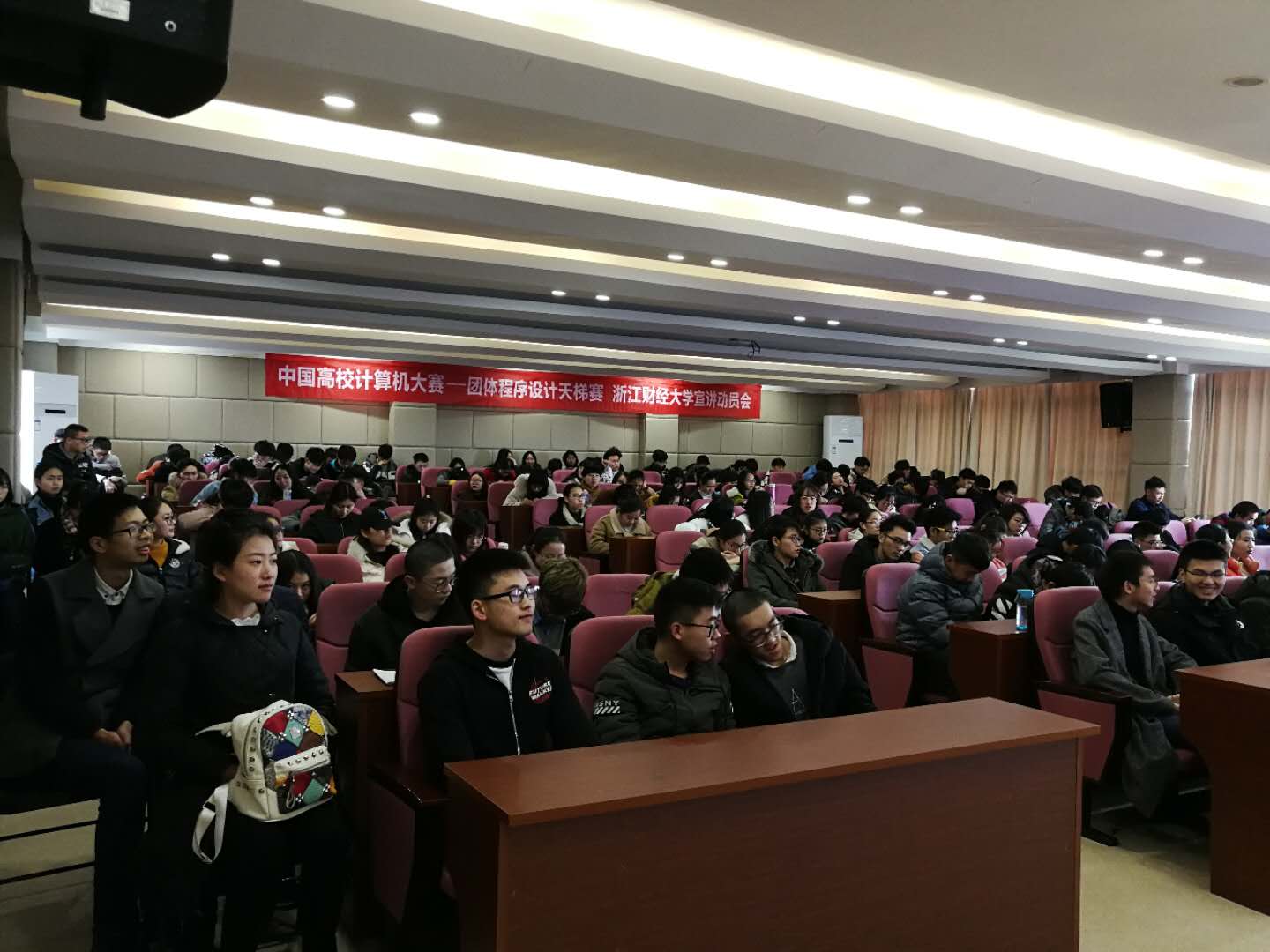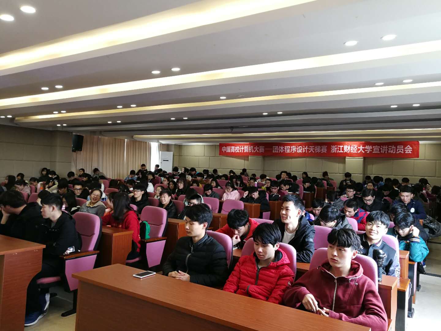 2018年3月6日13点30分,浙江财经大学2018中国高校计算机大赛——团体程序设计天梯赛宣讲动员大会在信工学院9302报告厅举行。近200名同学参加了本次宣讲动员大会,分别来自信工学院信息管理与信息系统、计算机、软件工程、电子商务四个专业,和数据科学学院信息与计算科学专业,现场十分踊跃,座无虚席。