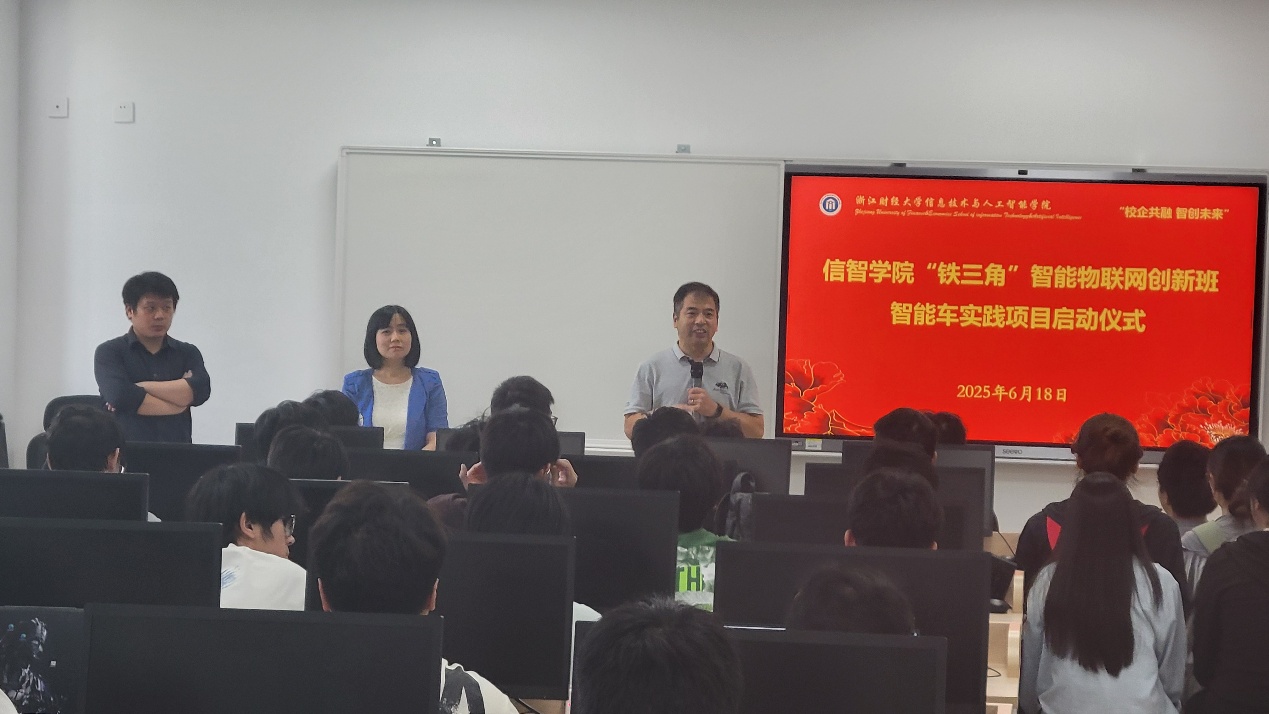 “铁三角”智能物联网创新班举行智能车实践项目启动仪式。学院领导、合作企业代表、专业教师以及计算机系24级全体学生参与,共同见证这一创新实践项目的开启。