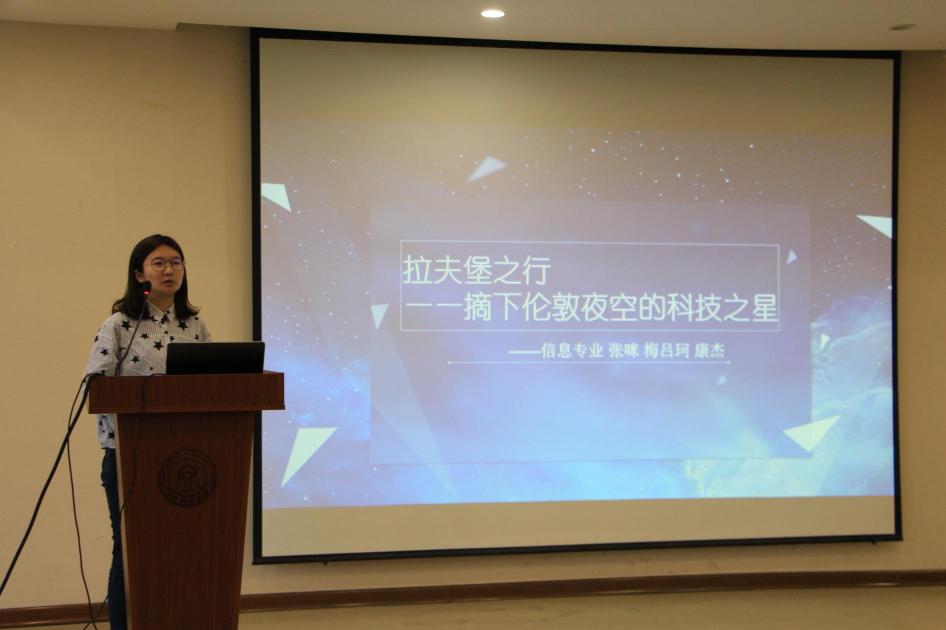 张咪同学以“摘下伦敦夜空的科技之星”为主题结合信息专业的特色,从隐私安全和互联网运用两方面讲述了中西方的种种差异,并向大家介绍了著名的牛津以及剑桥大学。