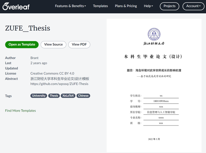 注:老师和同学们可以从本页面下载该模板,按照说明(附件1)使用;也可以打开链接//www.overleaf.com/latex/templates/zufe-thesis/ztbprkjkqzhm(如下图),注册账号后进入在线LaTeX编辑环境使用。请大家使用时遵守相关版权协议。