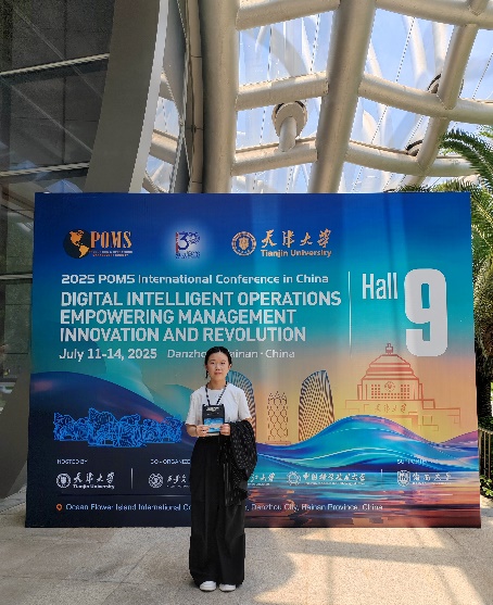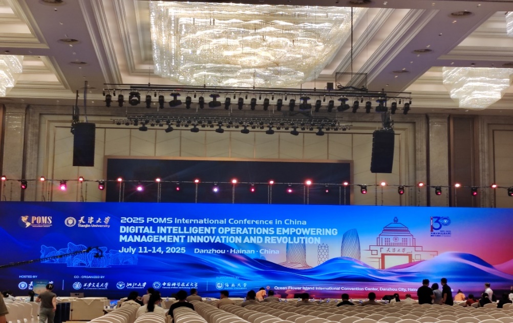 7月13日,我院23级管理科学与工程专业研究生陆志钰前往海南参加2025年中国生产与运营管理(POMS)国际会议(2025 POMS International Conference in China)。会议于7月11日-14日在海南省儋州市举行,主题为“数智化运营赋能管理创新与变革”,由天津大学主办,浙江大学、中国科学技术大学、西安交通大学协办,海南大学特别支持。本次会议共设有24个分会场与192个分论坛,来自国内外的1400余名专家学者通过专题报告、前沿成果展示与企业参访等多形式互动,围绕不同研究前沿与热点话题展开深入讨论。