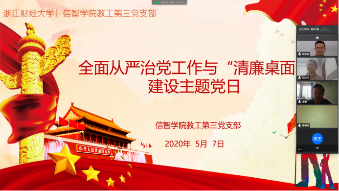 为深入贯彻执行中共中央办公厅印发的关于《党委(党组)落实全面从严治党主体责任规定》,落实学校全面从严治党工作暨“清廉校园”建设推进会的会议精神。2020年5月7日,信息管理与人工智能学院教工第三党支部在线开展全面从严治党与“清廉桌面建设”专题组织生活会,会议由支部书记杨水清主持,支部成员参加会议。