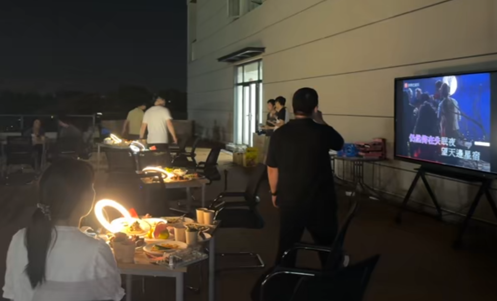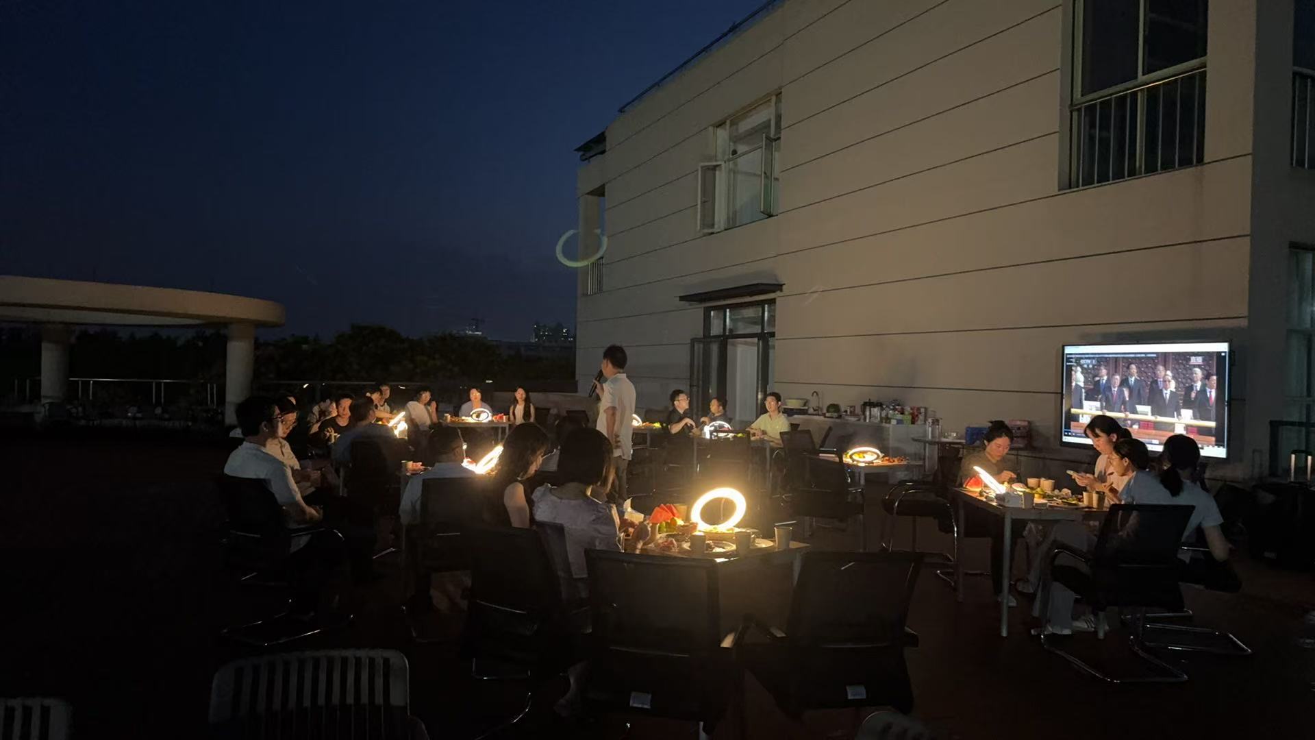 活动高潮当属卡拉OK 演唱环节。老师们深情演绎《月半小夜曲》《千千阕歌》等经典曲目,博得阵阵掌声。熟悉的旋律在露天平台间回荡,歌声与笑声交织相融,既点亮了秋夜的温馨底色,更将现场氛围推向高潮。