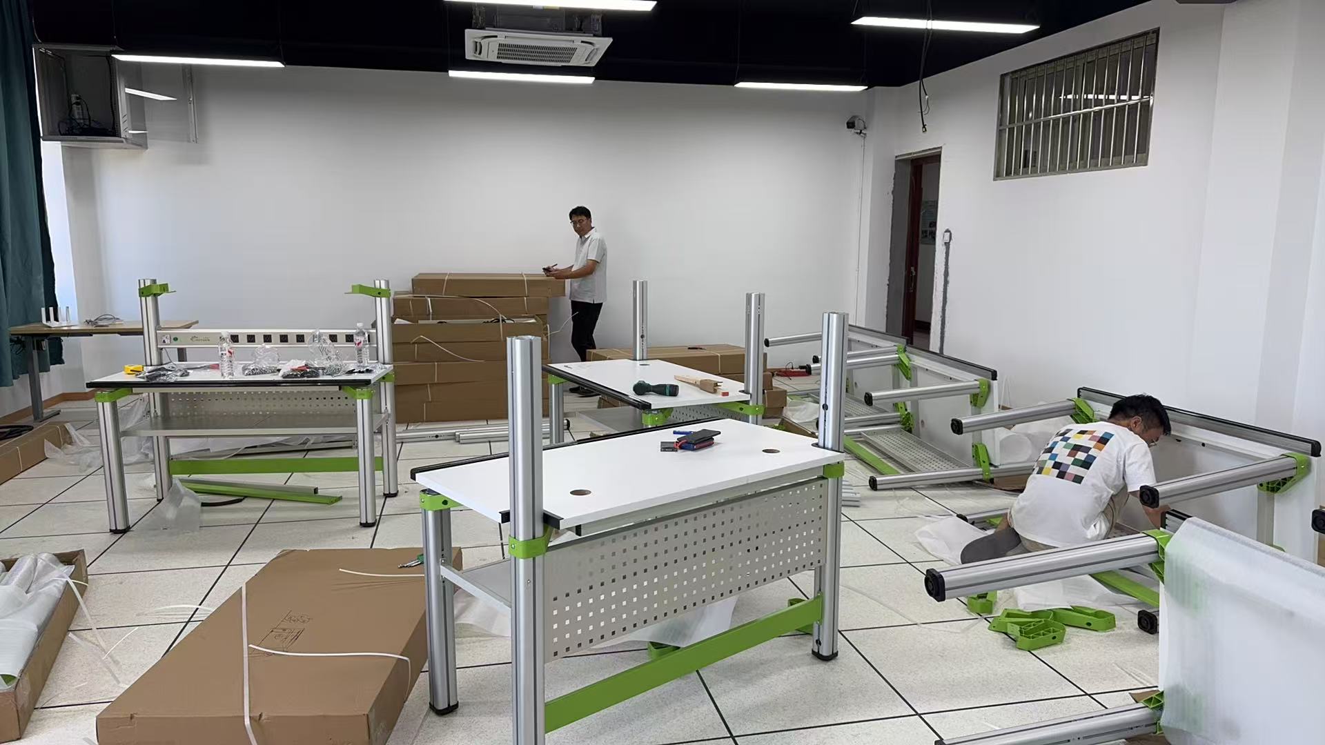 风格设计更清晰。电子技术实验室以黑色工业风吊顶、乳白色墙面搭配银灰色实验桌,辅以翠绿色点缀,营造专业且富格调的实验氛围;计算机软件实验室则全面翻新,拆除原有电风扇与日光灯,更换为白色吊顶与方块LED 灯,搭配钢架式实验桌,整体空间更显明亮整洁,大幅提升实验环境舒适度。
