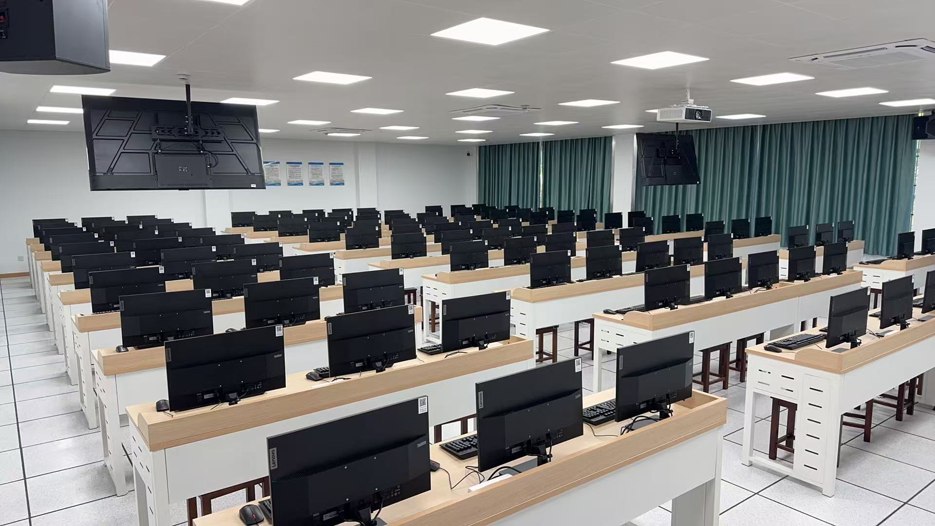 空间布局更优化。电子技术实验室采用“回字式” 布局,配置 26 张实验台,可同时容纳 52 名学生开展实验,满足集体教学需求;计算机软件实验室升级座位布局,将原有 “左、中、右各 4 座” 调整为 “3-5-3” 结构,同时整体前移增设一排座位,不仅总座位数增加 2 个,还额外新增 16 个隔位考试座位,兼顾日常教学与考试场景。