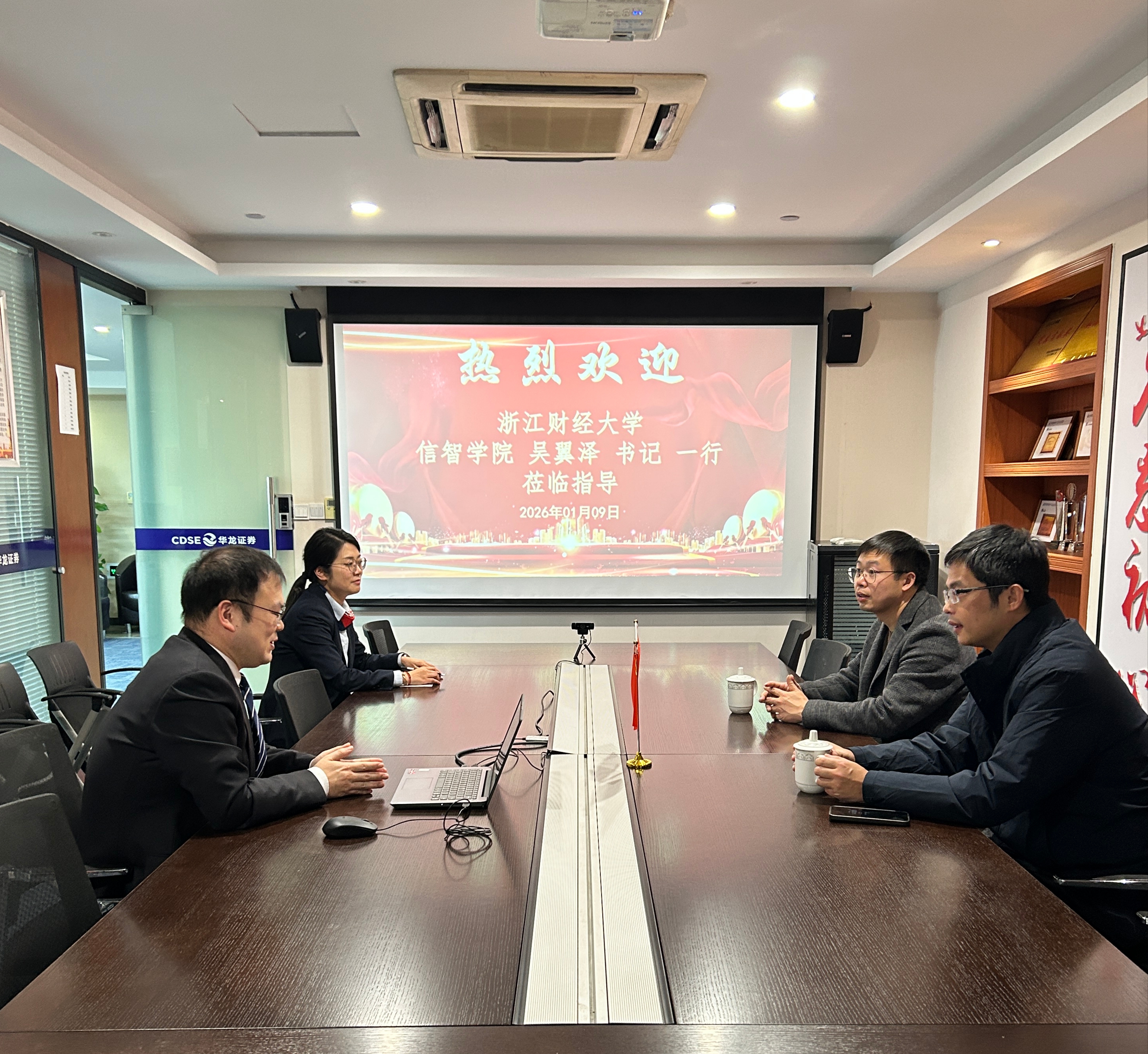 1月9日,学院党委书记吴翼泽、校友联络员徐军军赴华龙证券浙江分公司走访交流,并看望校友。此次走访旨在深化校企协同,搭建母校与校友沟通桥梁,对接行业人才需求,助力校企合作。华龙证券股份有限公司杭州玉古路营业部总经理张磊校友、风控总监叶雪芳校友、机构业务负责人董树宸校友热情接待了学院一行并参与座谈。