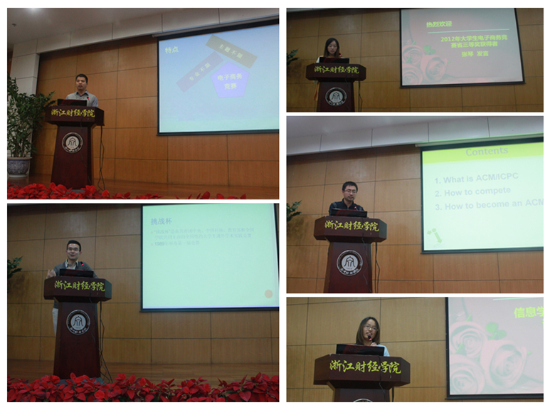 接下来,ACM程序设计竞赛、电子设计竞赛、电子商务竞赛及“挑战杯”科技学术竞赛四大赛事指导老师及获奖选手代表一一上台介绍竞赛特点,畅谈竞赛备战、实战经验,分享竞赛感受。老师们的专业解读给了每一位同学一个近距离了解竞赛的机会,更给在座的同学传递了坚定的信心,获奖代表感言让在场的同学真切的感受到科研竞赛离自己并不遥远,质朴又真挚的话语感动全场。最后,本次研讨会在热烈融洽的气氛中圆满结束。