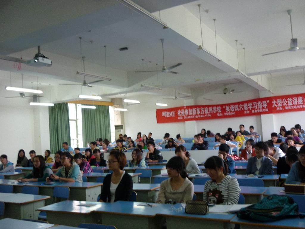 本次活动受到了同学们的广泛关注。立足于新东方四六级老师多年潜心研究精华,结合自己多年授课经验,讲师从单词,阅读理解,听力,作文四个方面分“四六级考什么”和“各种题型解题技巧”两条主线为同学们介绍如何应对英语四六级考试。如单词方面要根据艾宾浩斯记忆曲线确立复习点,背诵复习;平时准备名人实例能让你的考场作文笔酣墨饱,不易一字。并重点指出了听力的重要性及最有效的训练方法:“听力所占比例高达35%,我们在考前必须经常模仿并习惯纯正的发音,并对所听到的对话内容有一个画面的反馈而不是条件反射的翻译,这样才能真正在听力上有所突破。”