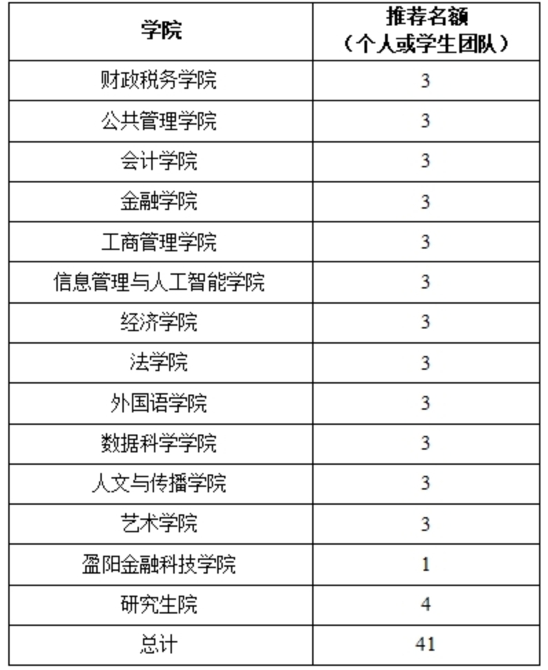 全校范围内以各学院、各部门为单位进行推荐,推荐名额如下表(研究生由研究生院组织申报与初评)。鼓励职能部门积极推荐学生团队参评“大学生年度人物”,限报1个,不占学院名额。