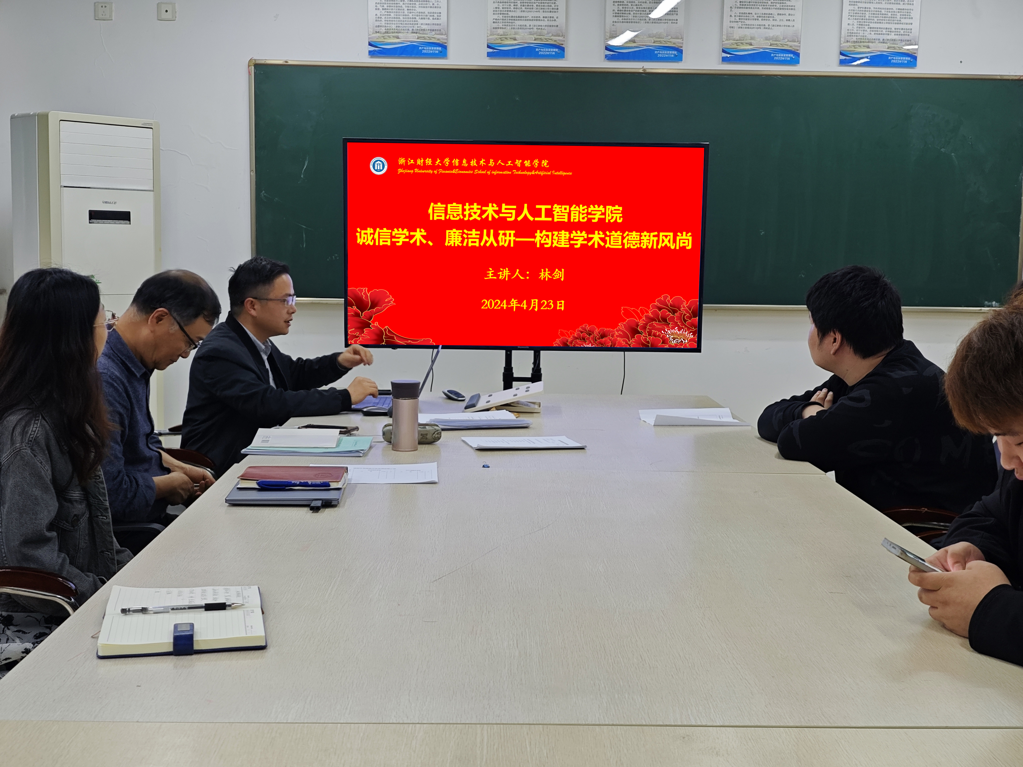在9304教室开展了“诚信学术、廉洁从研—构建学术道德新风尚”的学术诚信讲座。此次讲座由学院副院长林剑主讲,特邀教授姚建荣,研究生秘书杨天亦,辅导员吴泽勇及学院研究生参加本次活动。