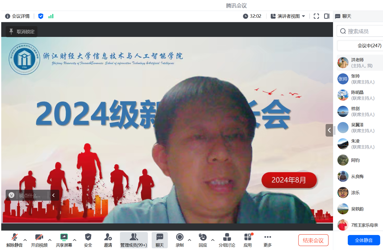 2024级新生家长会在线上顺利召开,学院院长张帅,党委书记吴翼泽,副院长林剑、朱凌,党委副书记吴轶韵,院长助理陈明晶,系主任陈琰宏、涂乐,学办主任洪宝华,新生班主任、辅导员及24级新生家长近300人参加本次家长会。会议由吴翼泽老师主持。