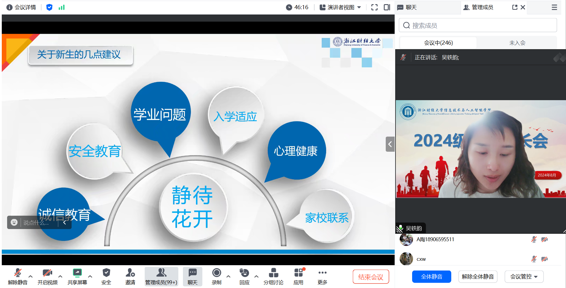 吴轶韵副书记向家长们介绍了我校学生管理制度和“新财经战略”背景下MAQ型“浙财金生”家校协同育人培养路径,并特别提醒临近的入学,开学各项注意事项。