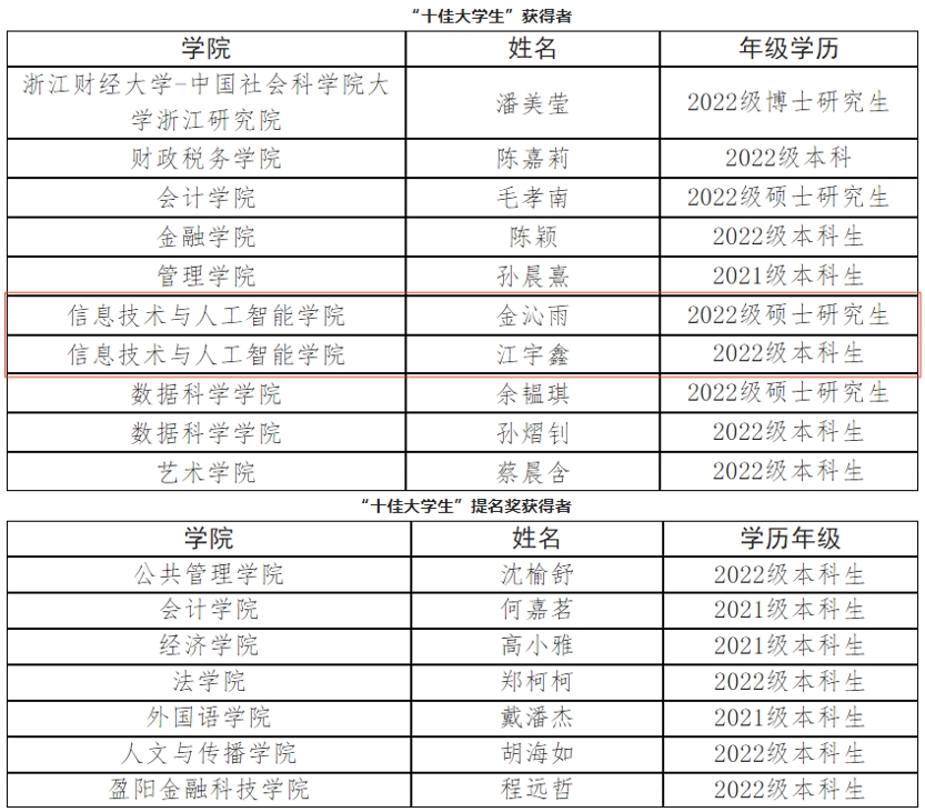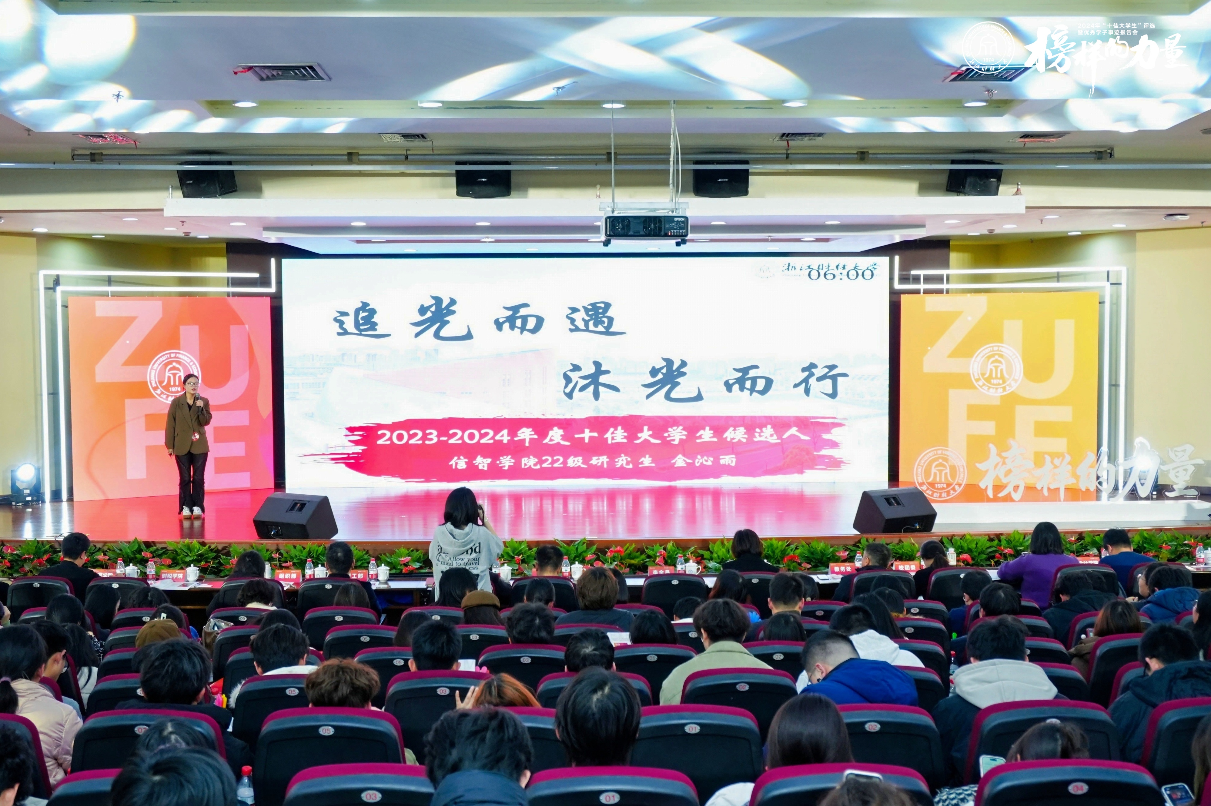 12月16日,2024年浙江财经大学“十佳大学生”评选暨优秀学子事迹报告会在学术第一报告厅圆满落下帷幕,我院学子经过组织推荐和现场展示评选,凭借德智体美劳各方面的优秀表现以及在学术研究、学科竞赛、社会实践、志愿公益等领域的突出成果,经过激烈的角逐,在全校众多优秀学生中脱颖而出。2022级管理科学与工程专业硕士研究生金沁雨、2022级人工智能专业本科生江宇鑫同时获评校“十佳大学生”,展现了信智学子昂扬向上的精神风貌、踏实进取的优良学风,发挥了积极的榜样作用。