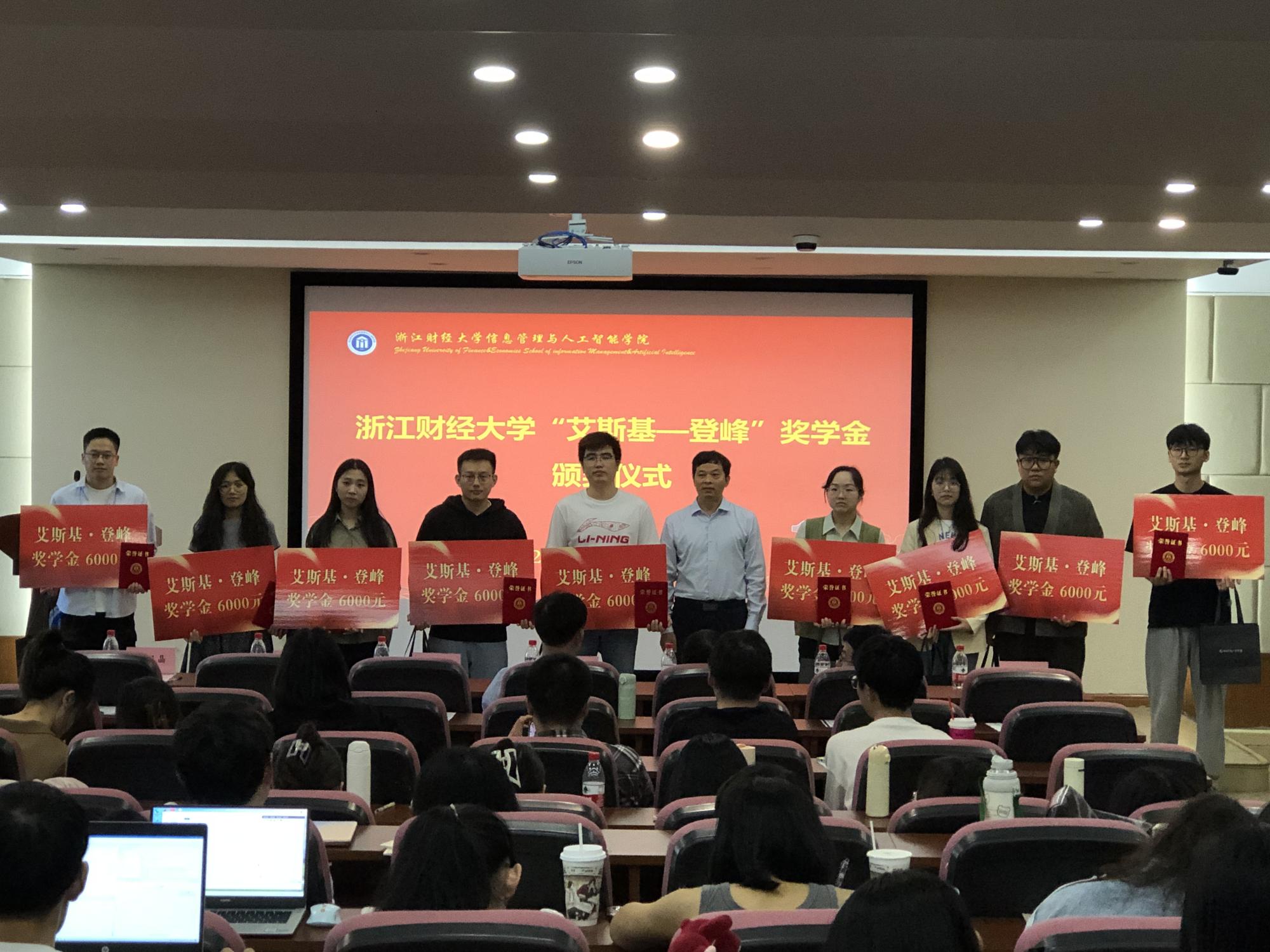 王建平校友为2023届申博成功的硕士毕业生颁发了2023年度“艾斯基—登峰”奖学金,并赠送了精美礼品。王建平校友通过分享自己在浙江财经大学上学的故事教导与会同学要珍惜美好年华,通过赠送公司产品望远镜鼓励信智学子登得更高、望得更远,在社会主义现代化建设新征程中再创佳绩。