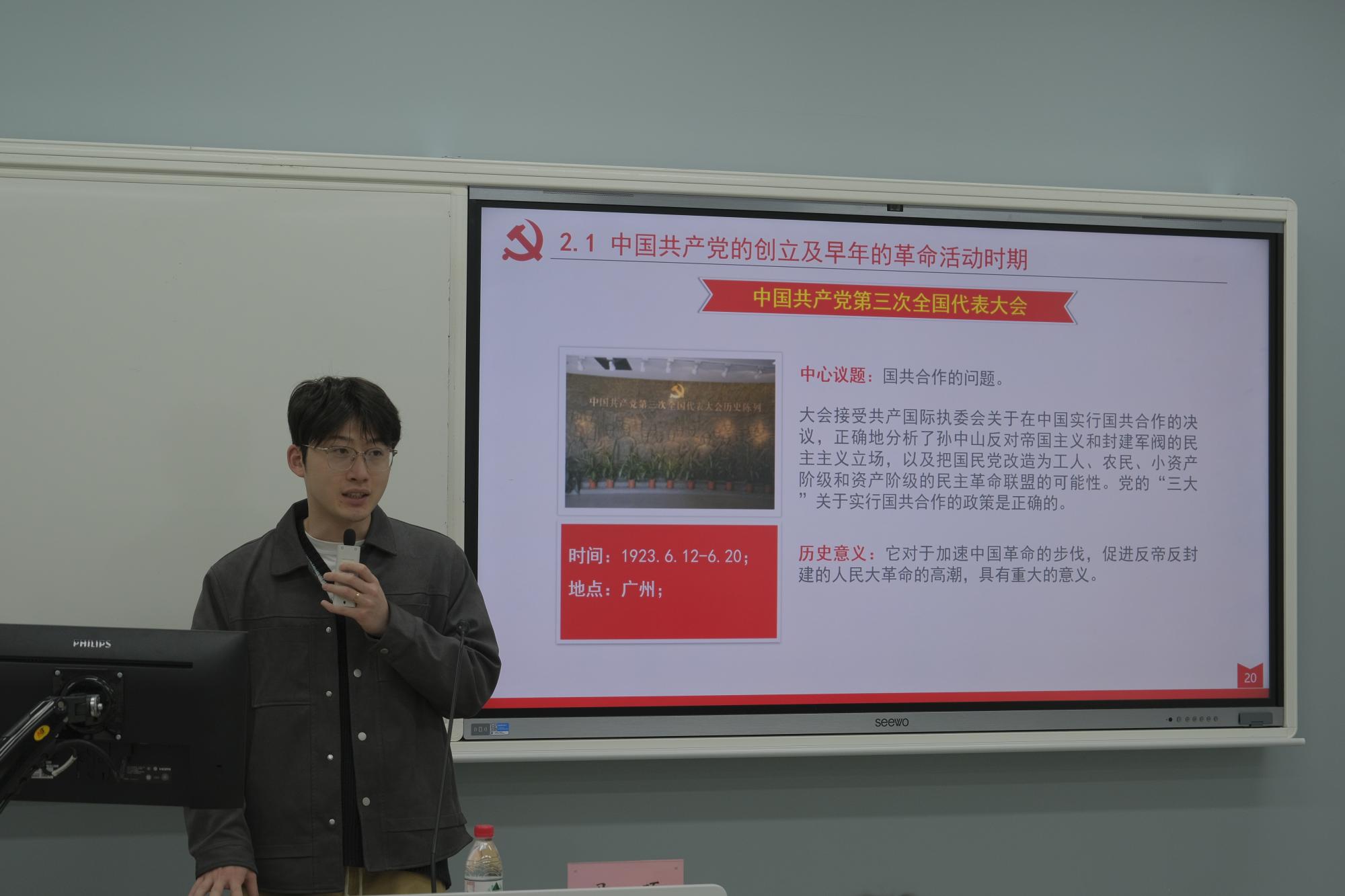 李靓老师以回忆党史国史、牢记初心使命为主题,从令人耳熟能详的“没有共产党就没有新中国”这句歌词引入了对党史国史的阐述;紧紧抓住“新”这个字,结合历史形势,阐明党对旧中国改造和对新中国建立的重要意义。她强调了学习党史的意义,指出回忆党史不仅仅是对历史的尊重保护,更是对青年意识的正确引导,对红色血脉的保护、赓续。