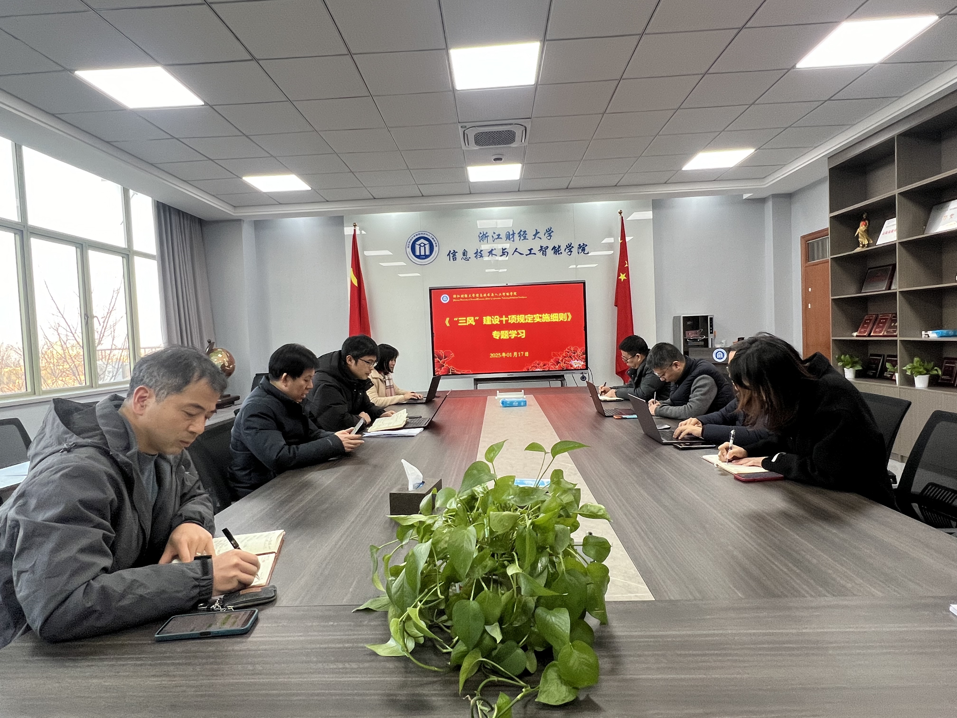 1月17日下午,学院召开党委理论学习中心组学习会议,传达学校党委理论中心组学习(扩大)会议精神,深入学习习近平总书记对审计工作的重要指示精神、二十届中央纪委四次全会和省纪委十五届四次全会精神、2025年全国教育工作会议精神、浙江省“两会”精神以及学校《“三风”建设十项规定实施细则》专题学习。会议由学院党委书记吴翼泽主持,理论学习中心组成员参加学习。