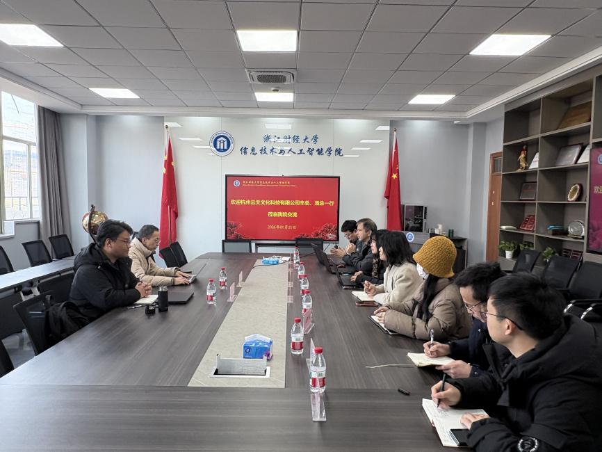 1月21日下午,杭州云爻文化科技有限公司总经理丰暴一行来我院交流。教学院长朱凌、学院副书记吴轶韵、院长助理兼计算机系主任陈明晶、实验中心主任章华、以及AIGC骨干教师赵梦瑶、徐军军、姜海银老师出席座谈会议。