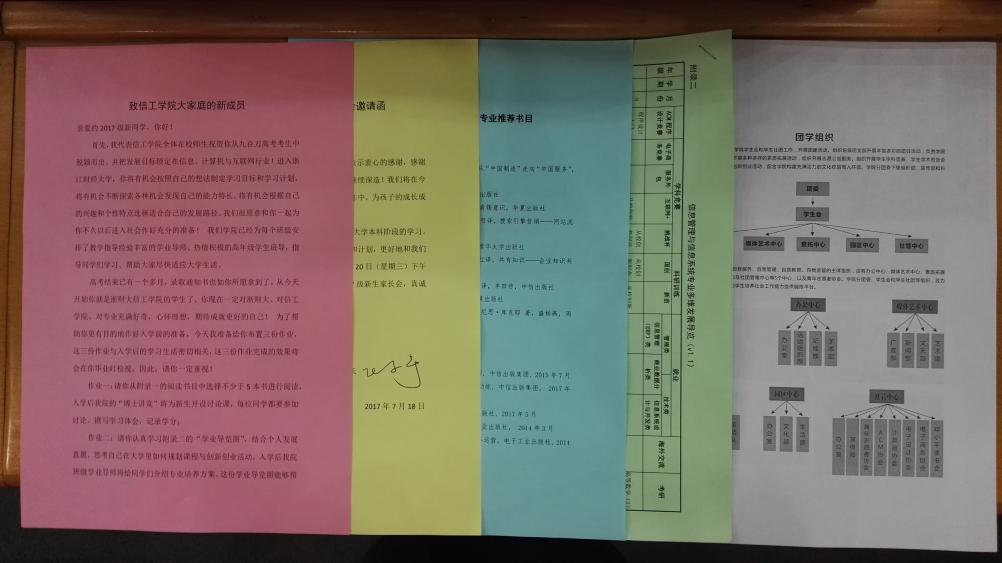 近日,随着招生录取工作的进行,我院已向全国各地录取于信息管理与工程学院的新生寄发通知书,包括《录取通知书》、《信工学院2017级新生家长会邀请函》、《致信工学院大家庭的新成员》、《浙江财经大学2017级新生入学指南》、《信工学院2017级新生各专业推荐书目》、各专业的《专业多维发展导览》以及《团学组织》等一系列材料。各份材料旨在帮助新生们建立入学事项、学院组织、专业情况、师资团队等内容的初步了解,落实暑期注意事项及各专业暑期作业,以增强新生对学院及专业的热情度和积极性。其中,我院提前建立各专业QQ群,并将群号、公众号、官网地址等信息附于材料内,由各班级班导、专业辅导员热情解答新生们的问题,进一步增强师生之间的联系。