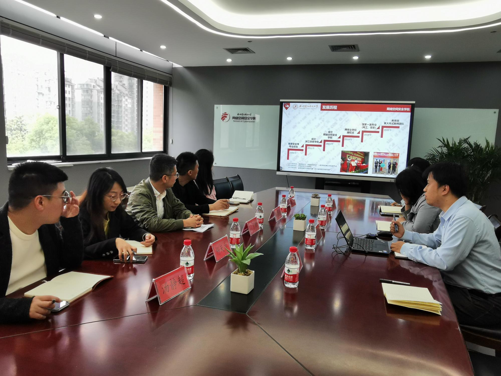 为进一步提升学院行政管理能力和水平,5月11日下午,信智学院办公室徐吉锋等一行五人前往杭州电子科技大学网络空间安全学院开展调研交流,杭州电子科技大学网络空间安全学院办公室主任王伟臻等四人出席交流会。