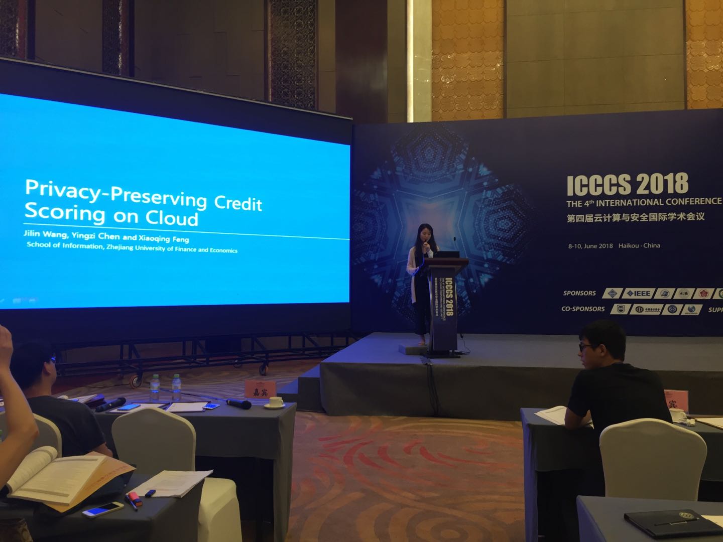 2018年6月8日-10日,由南京信息工程大学等举办的第四届云计算与安全国际会议(ICCCS2018)在中国海南省海口市顺利举行。云计算与安全国际会议(International Conference on Cloud Computing and Security,ICCCS)自2015年发起以来,已成功举办三届,现已成为国际知名的大型学术盛会。大会旨在为国内外从事计算机领域研究和工程技术的专家、学者、学生及技术人员,提供一个交流最新学术成果、探讨学术前沿问题的平台。本次会议聚集了来自中国、美国、俄罗斯、日本、法国、加拿大、意大利等世界各国的700多名专家学者,共同就云计算、信息隐藏、物联网安全、多媒体应用等问题展开探讨。我院16级企业管理专业研究生陈英姿参加了此次国际会议并在其分论坛就“Privacy-Preserving Credit Scoring on Cloud”主题做会议报告,并与专家学者们进行深入的交流和讨论。
