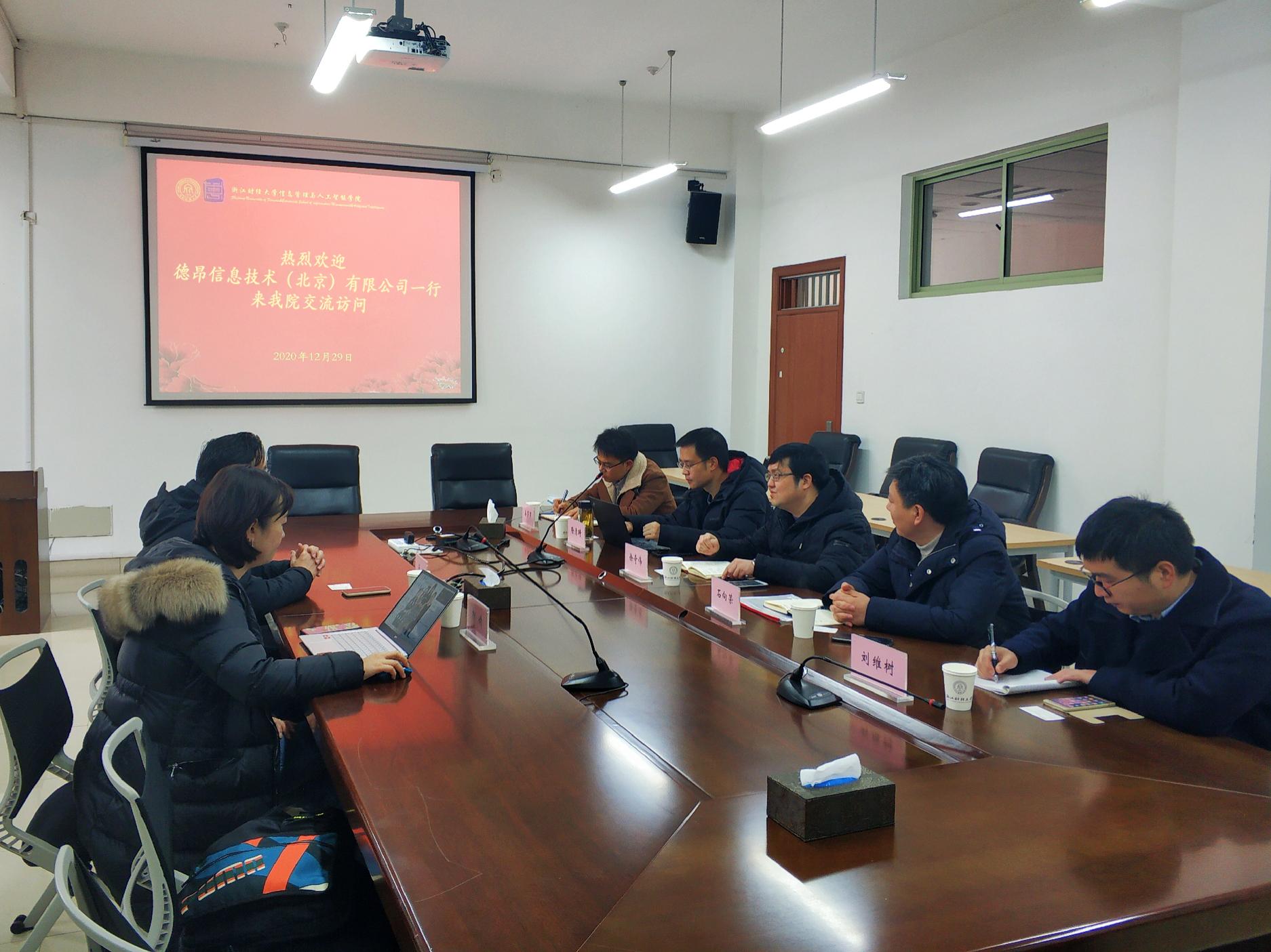 12月29日上午,德昂信息技术(北京)有限公司华东区域销售总监董鹏一行来我院交流并与信息管理系就产学研合作开展深入洽谈。学院党委书记徐奇伟、经管实验中心主任石向荣、信息管理系主任隆清琦以及刘维树、姜罗罗等老师参加了此次洽谈。