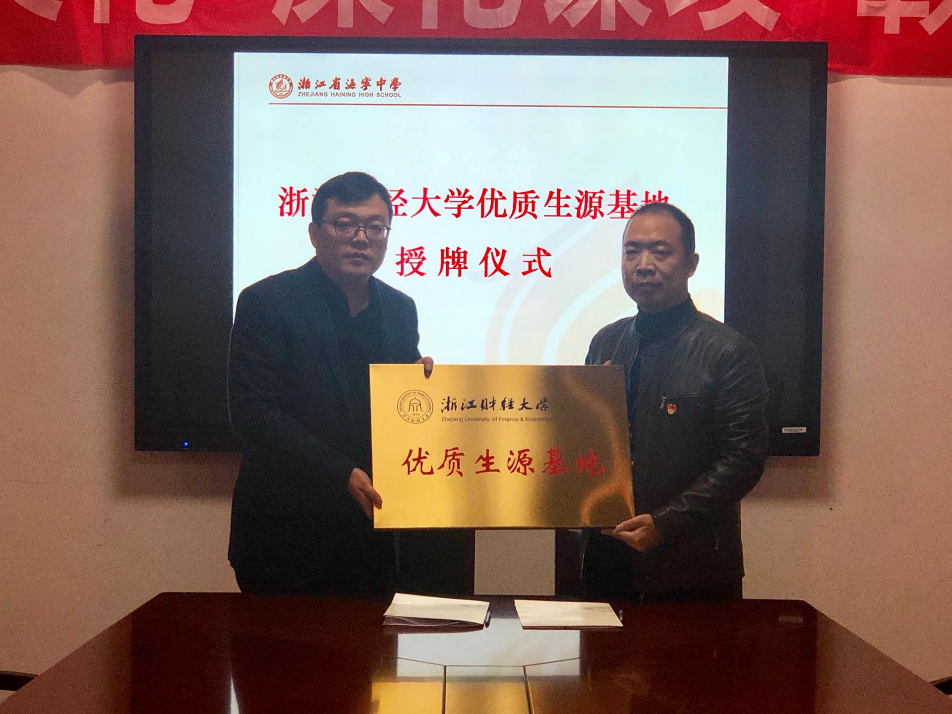 最后陆颋浩副书记向海宁中学授予“浙江财经大学优质生源基地”铜牌并进行了签约仪式。