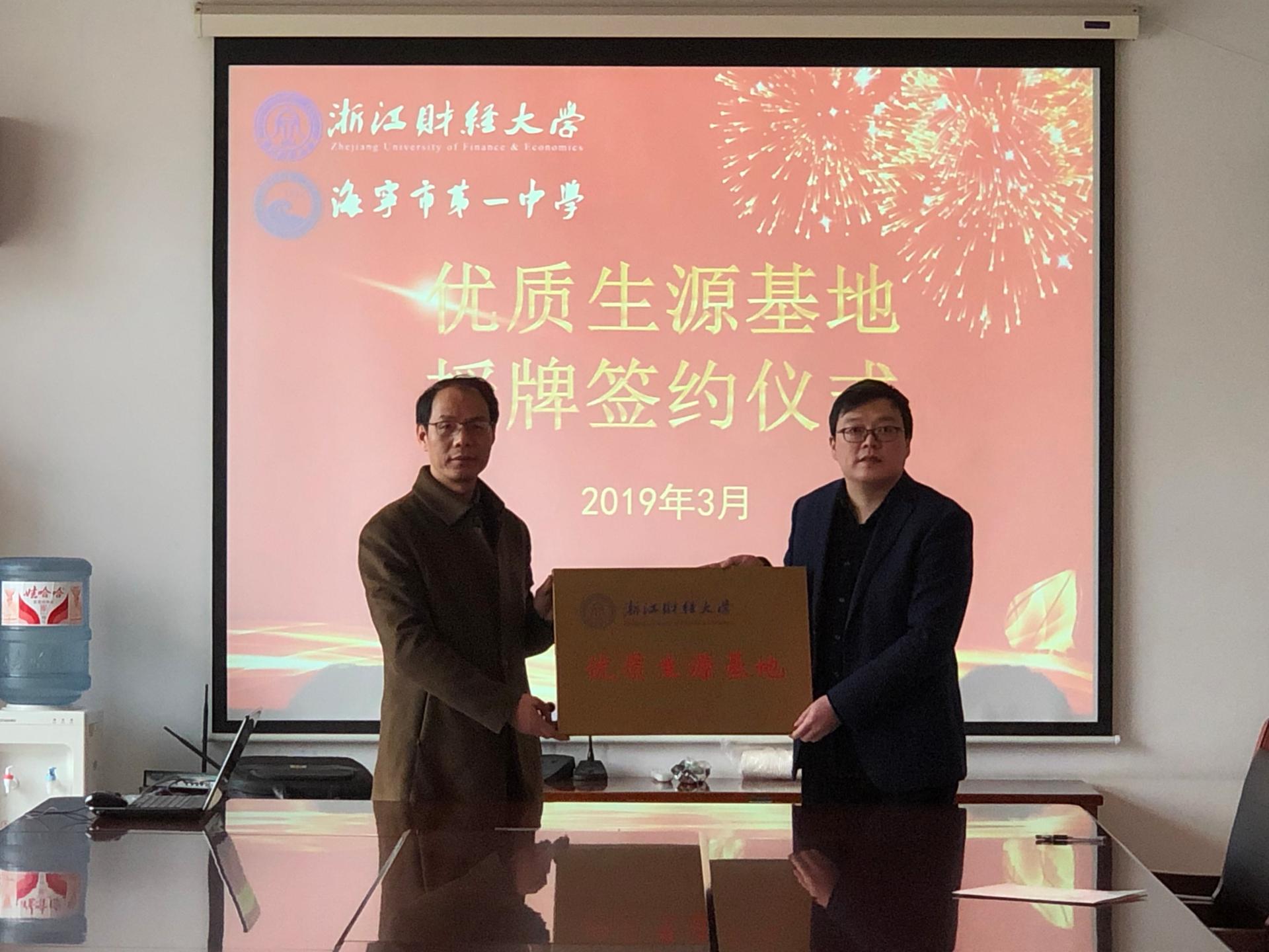 最后陆颋浩书记向浙江省海宁市第一中学、海宁市高级中学授予“浙江财经大学优质生源基地”铜牌并进行了签约仪式。