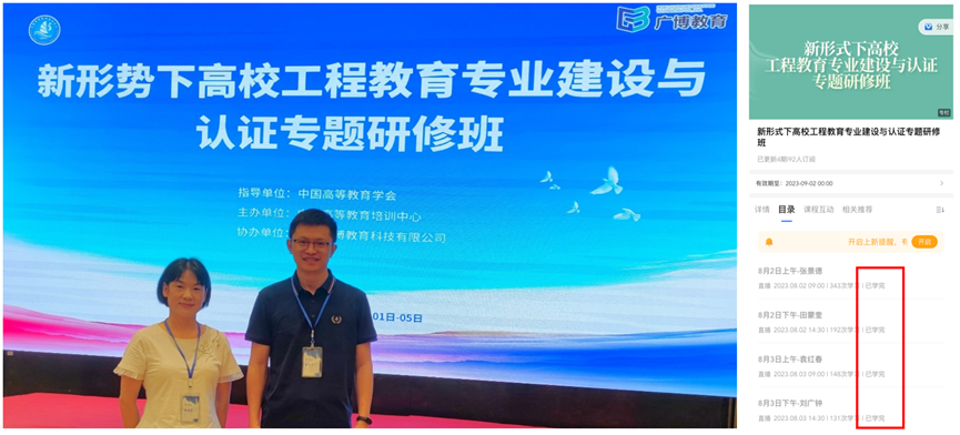 2023年8月1日至8月5日,中国高等教育培训中心在贵州省贵阳市举办“新形势下高校工程教育专业建设与认证专题研修班”,我院涂乐、吴叶葵老师线下参加,王婉茹、林玮玮老师线上参加研修班,并顺利结业。